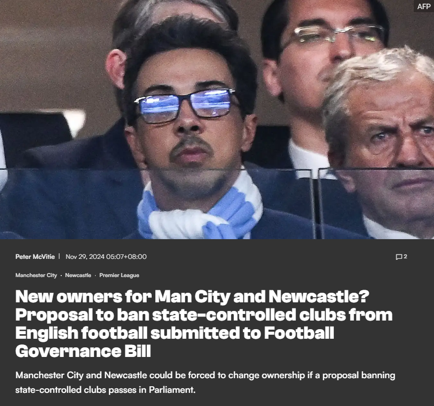 雷速体育11月29日讯 根据《GOAL》的报道,有英国议员提出在英国《足球治理法案》的修正案中加上禁止国有资本控股的条款,如果此提议得到通过,曼城和纽卡2支英超球队将被迫易主。